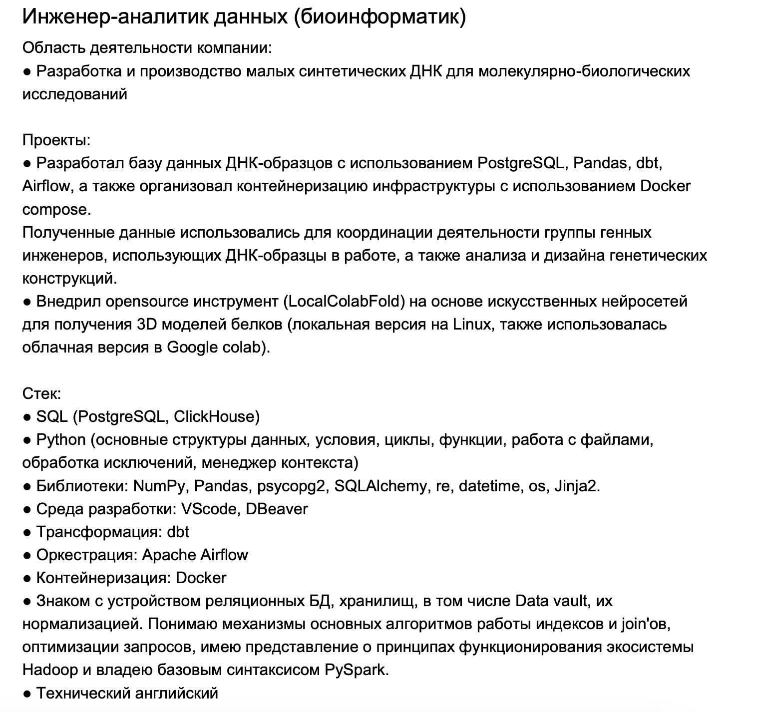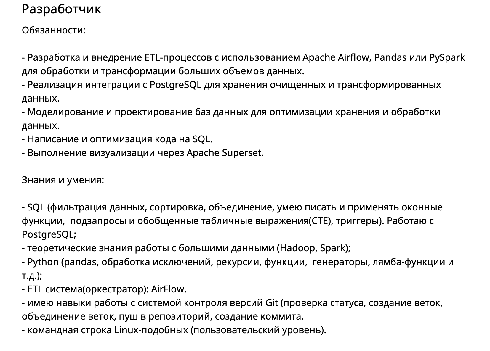 | Работал аналитиком (по факту монтажником). Написал телеграм-бота, который собирал данные по расходникам с каждого объекта и складывал всё в СУБД PostgreSQL. Всё было развёрнуто в Docker на сервере, и каждый вечер/неделю/месяц Airflow читал данные из БД и внутри pandas или PySpark строил витрины/отчёты для руководства. |