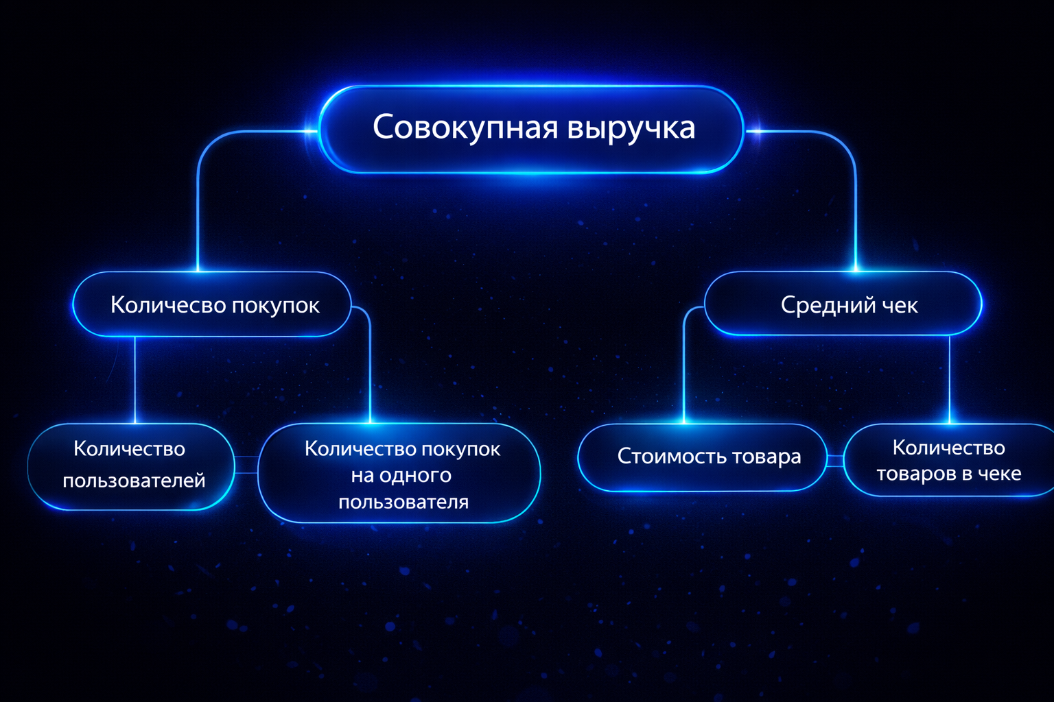 Дерево метрик — это разделение стратегии развития продукта на части. Как только выстраивается иерархия, становится ясно, что и на какой показатель влияет. Например, что выручка выросла не просто так, а за счёт увеличения числа клиентов или благодаря снижению стоимости привлечения пользователя.